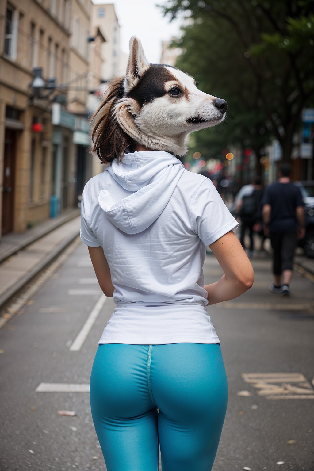 photo of a beautiful 1girl wearing casual shirt with a hoodie and leggings, city street, messy medium hair, slim body, view from back, medium upper body shot, looking at the camera, cute smile, shallow depth of field <lora:1girlDistortionU:1.5>