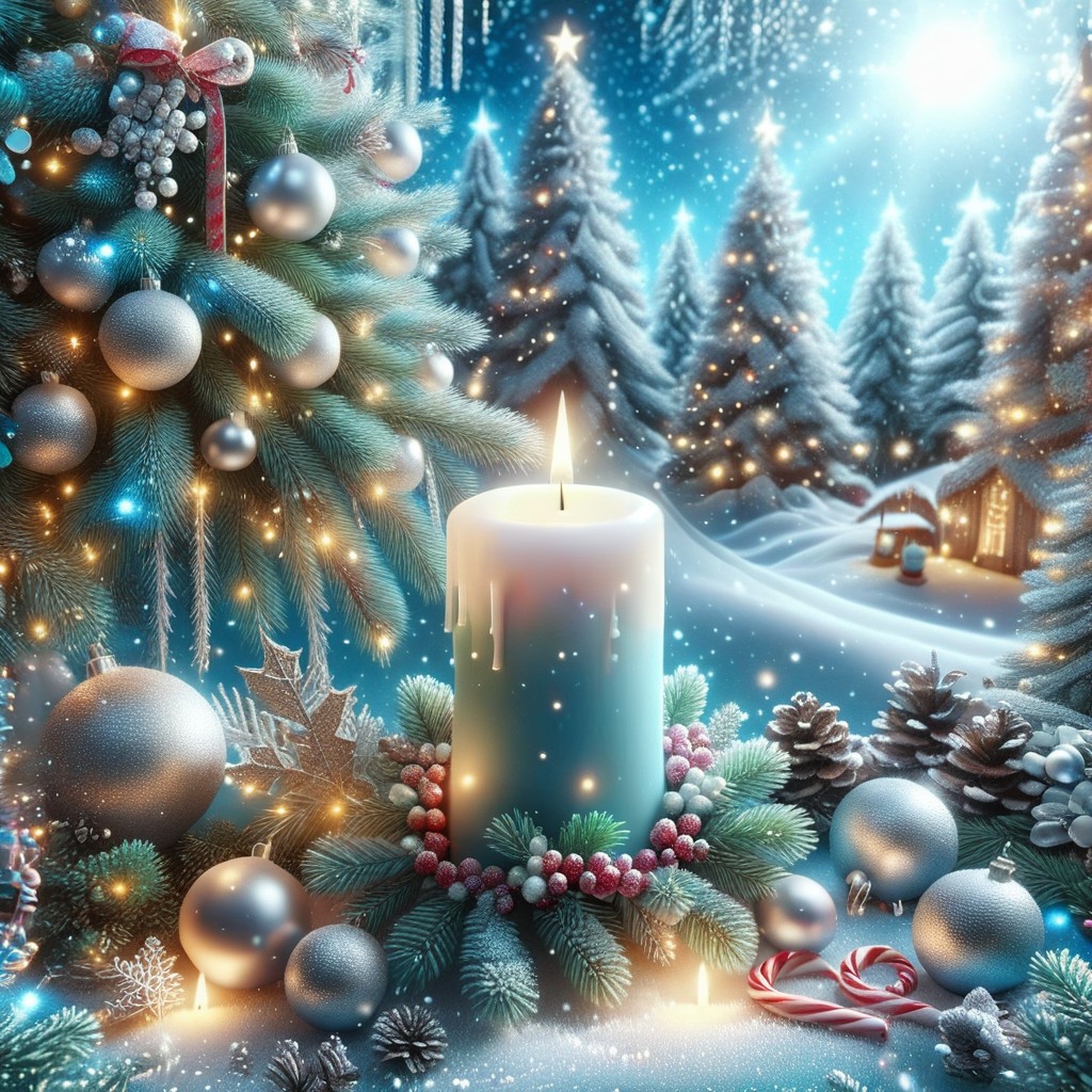 Light blue Christmas candle located on one side of the image. Background with Christmas pine branches, colorful lights. Back ground Large Christmas tree, with bright silver and light blue and multicolored garlands. Background from light blue to silver light scale. 3D rendering, fashion, cute, fantasy art, high definition, ultra-real, Christmas style.
