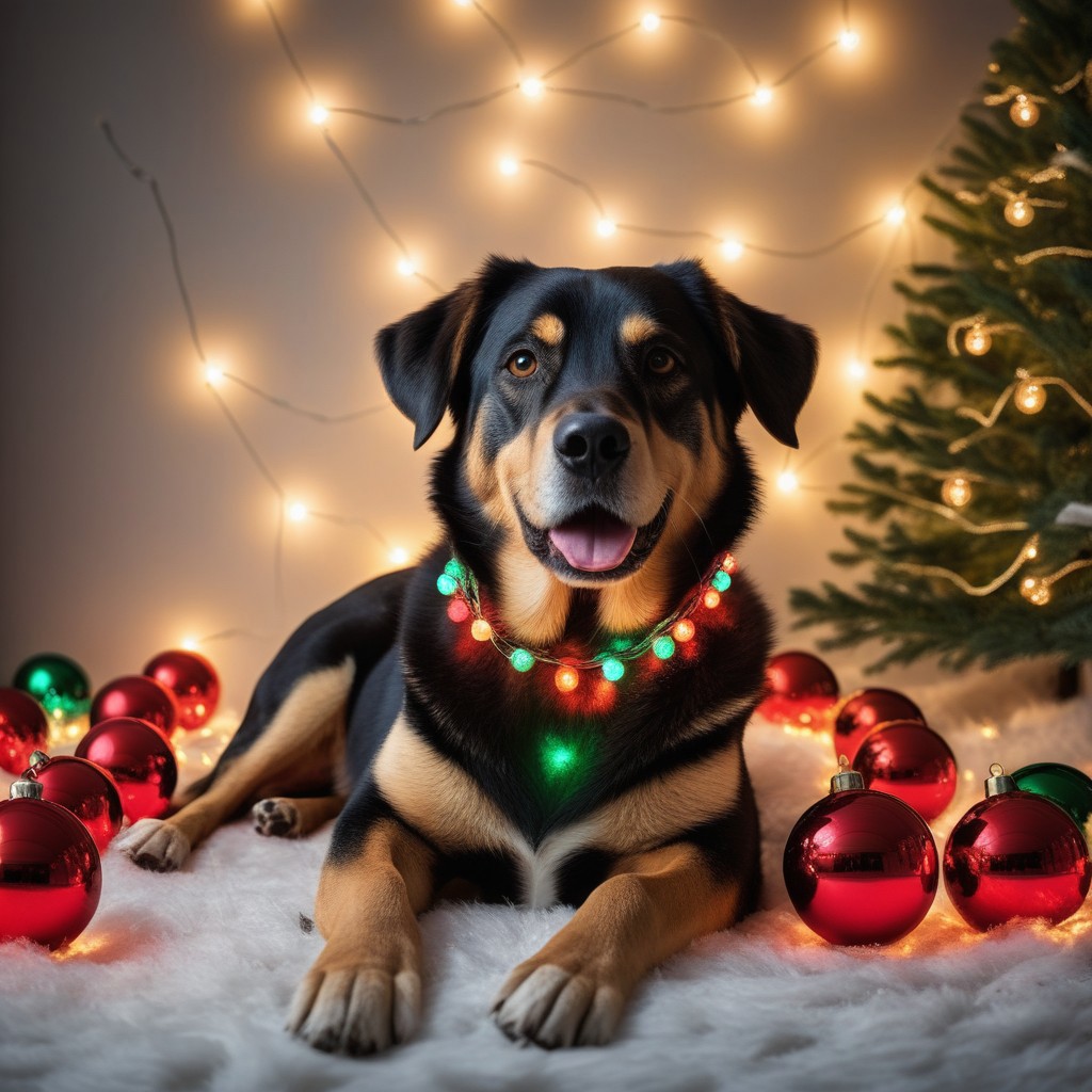 photography very realist dog playing with lots of Christmas lights and Christmas balls around him, Christmas decor background