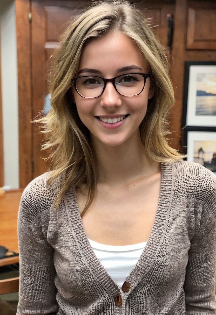 18 year old, European, woman, b cup breasts, 100 lbs, curdled hair, brown hair with blonde highlights, slight frekels, nerdy, sexy, wearing nothing but an open cardigan
