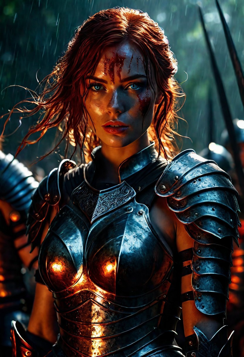Ultra detailed digital art masterpiece Warrior girl dressed in a iron Armor and red mini skirt, Standing on a battlefield at the head of an army of knights, where a bloody slaughter is taking place, standing in battle pose, a dark epic fantasy, perfect lighting, beautiful Sadie Sink as Warrior girl, attractive woman, elegant, beautiful woman of athletic body, epic shot of the whole Warrior girl, unreal engine 5 nanite quality, dark fantasy, dark environment, very stormy day, LOTR style, dark washed out eyeliner, no make up, natural bloody pale face, realistic blue eyes, ultra detailed atmospheric details, beautiful glowing effects, sparkle effects, realistic body proportions, beautiful face proportions, complex masterpiece, wavy red hair, creative glowing detailed tattoos, complex physics, enhanced colors, complimentary colors, ultra detailed raytracing reflections, Ultra detailed complex background, environment feels alive, direct eye contact, dramatic lighting, wet and sweaty skin, beautiful firm Breasts, Daylight, Concept art by Greg Rutkowski, adding to the intense and dynamic atmosphere of the scene.