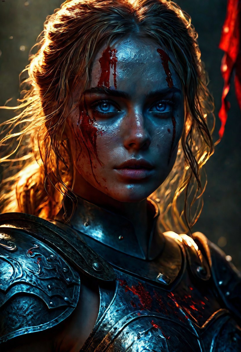 Ultra detailed digital art masterpiece Warrior girl dressed in a iron Armor and red mini skirt, Standing on a battlefield at the head of an army of knights, where a bloody slaughter is taking place, standing in battle pose, a dark epic fantasy, perfect lighting, beautiful Sadie Sink as Warrior girl, attractive woman, elegant, beautiful woman of athletic body, epic shot of the whole Warrior girl, unreal engine 5 nanite quality, dark fantasy, dark environment, very stormy day, LOTR style, dark washed out eyeliner, no make up, natural bloody pale face, realistic blue eyes, ultra detailed atmospheric details, beautiful glowing effects, sparkle effects, realistic body proportions, beautiful face proportions, complex masterpiece, wavy blonde hair, creative glowing detailed tattoos, complex physics, enhanced colors, complimentary colors, ultra detailed raytracing reflections, Ultra detailed complex background, environment feels alive, direct eye contact, dramatic lighting, wet and sweaty skin, beautiful firm Breasts, Daylight, Concept art by Greg Rutkowski, adding to the intense and dynamic atmosphere of the scene.