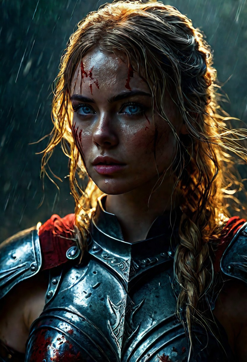 Ultra detailed digital art masterpiece Warrior girl dressed in a iron Armor and red mini skirt, Standing on a battlefield at the head of an army of knights, where a bloody slaughter is taking place, standing in battle pose, a dark epic fantasy, perfect lighting, beautiful Sadie Sink as Warrior girl, attractive woman, elegant, beautiful woman of athletic body, epic shot of the whole Warrior girl, unreal engine 5 nanite quality, dark fantasy, dark environment, very stormy day, LOTR style, dark washed out eyeliner, no make up, natural bloody pale face, realistic blue eyes, ultra detailed atmospheric details, beautiful glowing effects, sparkle effects, realistic body proportions, beautiful face proportions, complex masterpiece, wavy blonde hair, creative glowing detailed tattoos, complex physics, enhanced colors, complimentary colors, ultra detailed raytracing reflections, Ultra detailed complex background, environment feels alive, direct eye contact, dramatic lighting, wet and sweaty skin, beautiful firm Breasts, Daylight, Concept art by Greg Rutkowski, adding to the intense and dynamic atmosphere of the scene.