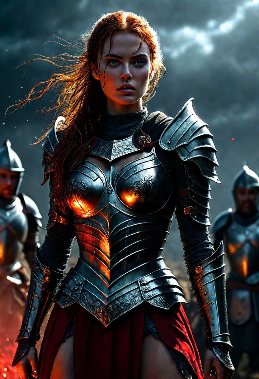 Ultra detailed digital art masterpiece Warrior girl dressed in a iron Armor and red mini skirt, Standing on a battlefield at the head of an army of knights, where a bloody slaughter is taking place, standing in battle pose, a dark epic fantasy, perfect lighting, beautiful Sadie Sink as Warrior girl, attractive woman, elegant, beautiful woman of athletic body, epic shot of the whole Warrior girl, unreal engine 5 nanite quality, dark fantasy, dark environment, very stormy day, LOTR style, dark washed out eyeliner, no make up, natural bloody pale face, realistic blue eyes, ultra detailed atmospheric details, beautiful glowing effects, sparkle effects, realistic body proportions, beautiful face proportions, complex masterpiece, wavy black hair, creative glowing detailed tattoos, complex physics, enhanced colors, complimentary colors, ultra detailed raytracing reflections, Ultra detailed complex background, environment feels alive, direct eye contact, dramatic lighting, wet and sweaty skin, beautiful firm Breasts, Daylight, Concept art by Greg Rutkowski, adding to the intense and dynamic atmosphere of the scene.