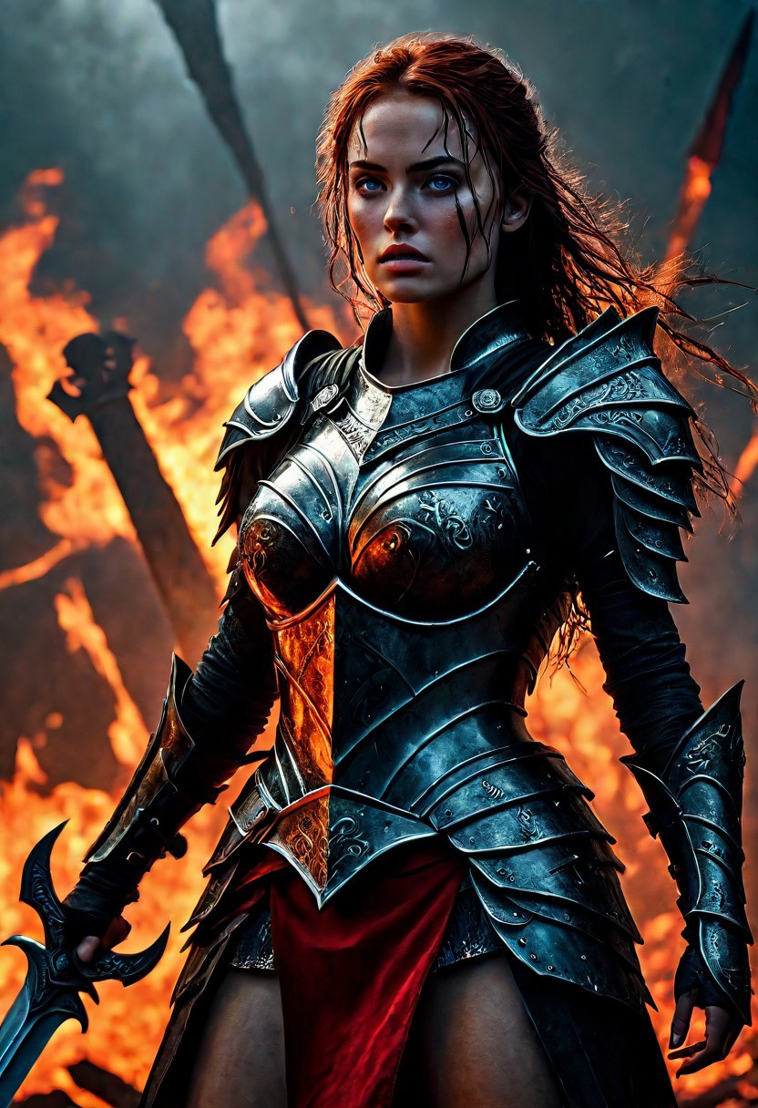 Ultra detailed digital art masterpiece Warrior girl dressed in a iron Armor and red mini skirt, Standing on a battlefield at the head of an army of knights, where a bloody slaughter is taking place, standing in battle pose, a dark epic fantasy, perfect lighting, beautiful Sadie Sink as Warrior girl, attractive woman, elegant, beautiful woman of athletic body, epic shot of the whole Warrior girl, unreal engine 5 nanite quality, dark fantasy, dark environment, very stormy day, LOTR style, dark washed out eyeliner, no make up, natural bloody pale face, realistic blue eyes, ultra detailed atmospheric details, beautiful glowing effects, sparkle effects, realistic body proportions, beautiful face proportions, complex masterpiece, wavy raven black hair, creative glowing detailed tattoos, complex physics, enhanced colors, complimentary colors, ultra detailed raytracing reflections, Ultra detailed complex background, environment feels alive, direct eye contact, dramatic lighting, wet and sweaty skin, beautiful firm Breasts, Daylight, Concept art by Greg Rutkowski, adding to the intense and dynamic atmosphere of the scene.