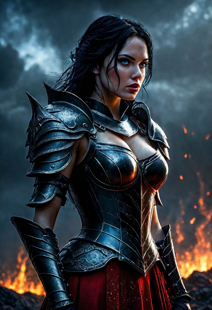 Ultra detailed digital art masterpiece Warrior Snow White girl dressed in a iron Armor and red mini skirt, Standing on a battlefield at the head of an army of knights, where a bloody slaughter is taking place, standing in battle pose, a dark epic fantasy, perfect lighting, beautiful Warrior Snow White girl, attractive woman, elegant, beautiful woman of athletic body, epic shot of the whole Warrior Snow White girl, unreal engine 5 nanite quality, dark fantasy, dark environment, very stormy day, LOTR style, dark washed out eyeliner, no make up, natural bloody pale face, realistic blue eyes, ultra detailed atmospheric details, beautiful glowing effects, sparkle effects, realistic body proportions, beautiful face proportions, complex masterpiece, wavy raven black hair, creative glowing detailed tattoos, complex physics, enhanced colors, complimentary colors, ultra detailed raytracing reflections, Ultra detailed complex background, environment feels alive, direct eye contact, dramatic lighting, wet and sweaty skin, beautiful firm Breasts, Daylight, Concept art by Greg Rutkowski, adding to the intense and dynamic atmosphere of the scene.