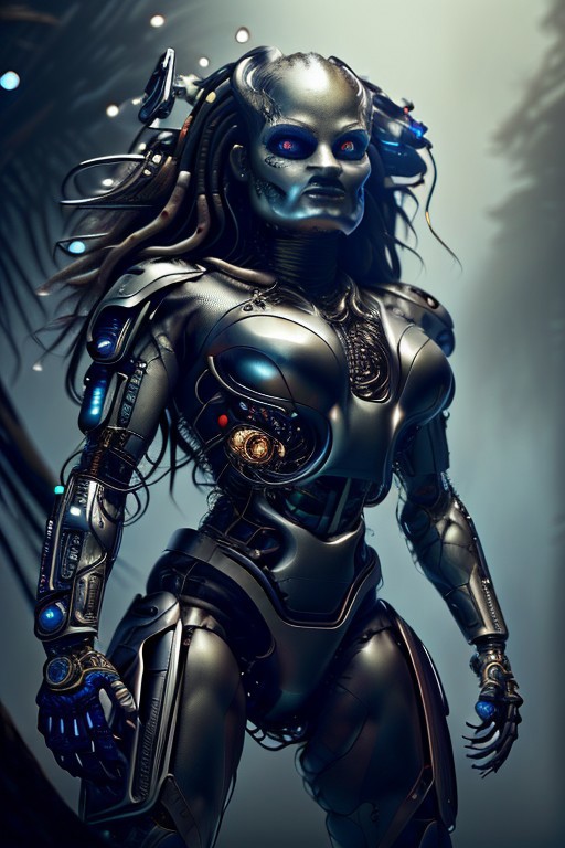 cinematic film still silverpulse, cyborg yautja, simple background, high quality, artistic, vibrant colors, detailed textures. futuristic sleek/glossy silver and blue glow, vibrant colors, detailed textures., Concept art, cyborg, background, vintage, modern, SilverPulse, <lora:SilverPulseMorphXL:0.8>, excellent composition, artistic, highly detail, holy, sunny, dynamic dramatic beautiful full taking . shallow depth of field, vignette, highly detailed, high budget, bokeh, cinemascope, moody, epic, gorgeous, film grain, grainy, dutch angle,