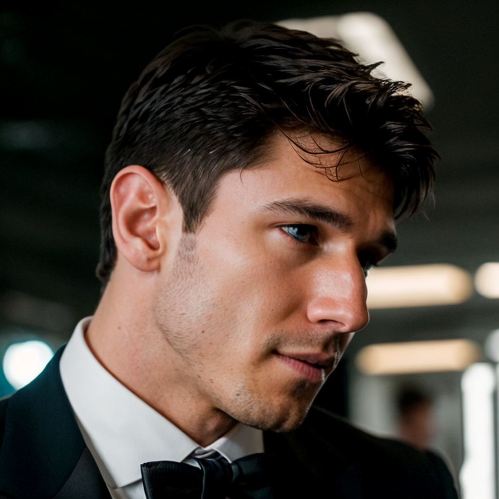 DSLR photo of samcushing person using a tuxedo.face side portrait.in blade runner.daylight.professional photography.high resolution.detailed photo.RAW.still film.f/16.uhd.hdr.4k <lora:samcushing_59850:1>