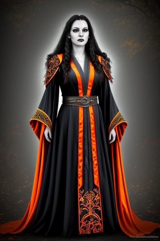 (masterpiece:1.2), (best quality,:1.2), 8k, HDR, ultra detailed, ((photorealistic)), perfect anatomy, professional light, cinematic lighting, fashion photography, ambient lighting,<lora:detail_slider_v4:3>, a female wizard, ((full body shot)), tiara, earrings, dark makeup, wearing intricate fantasy black and orange coat with belt, intricate robes, FanRo, <lora:FantasyRobes-10:0.6>, fantasy picture in the style of Tolkien, Middle Earth, Lord of the Rings, epiCPhoto