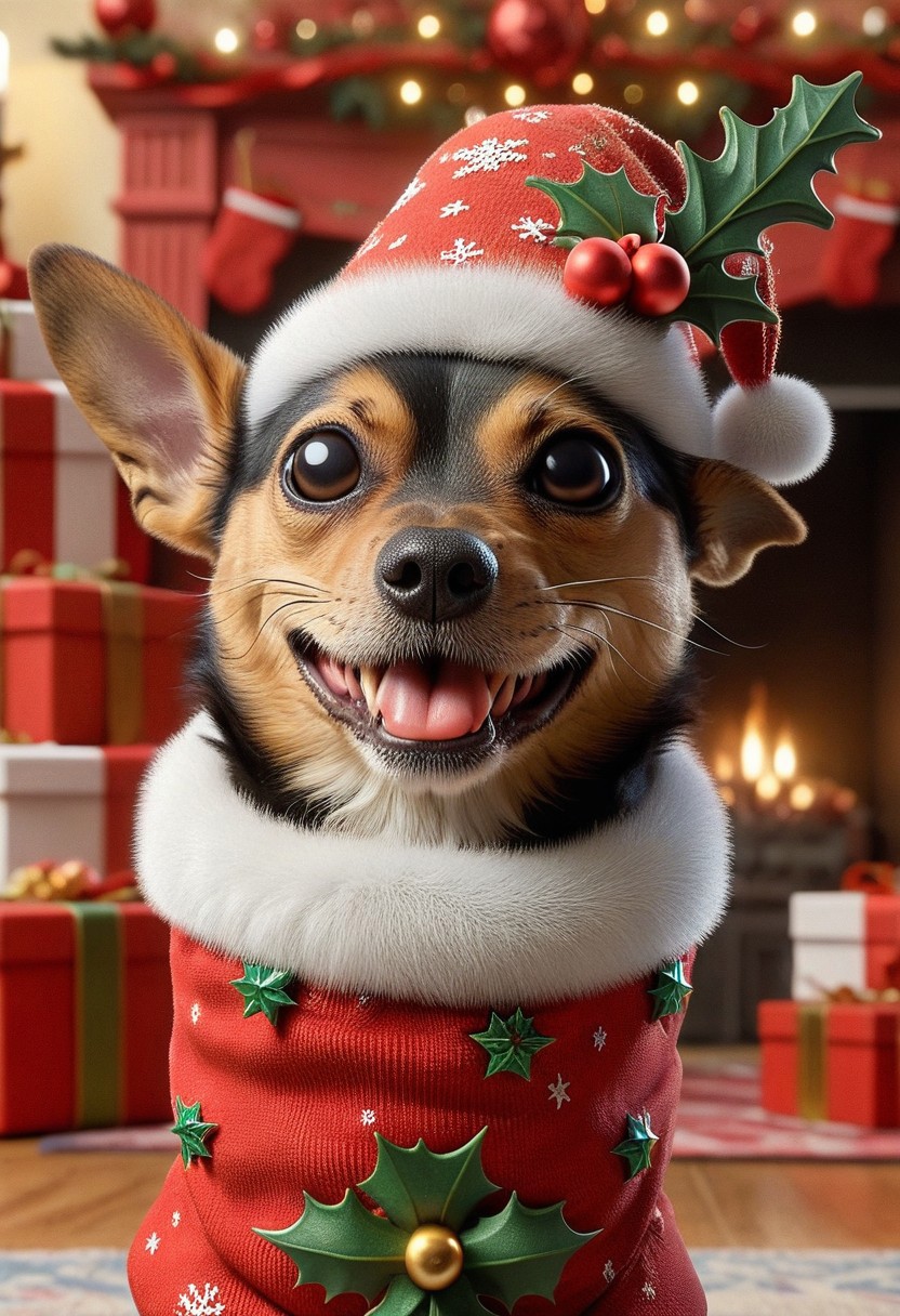 dog sticking its head out of a Christmas stocking