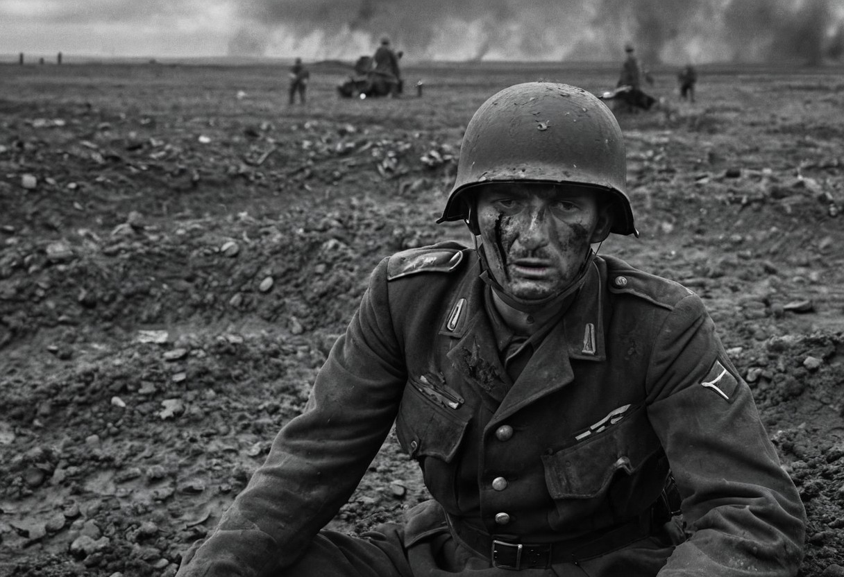 1 man, world war 2 soldier on the Eastern Front, (dying), (explosions), face in shadows, black and white, bleeding out, exhausted, German Soldier, Stahlhelm helmet, muddy field, bleak landscape, last moments, <lora:Desolation:1.1>