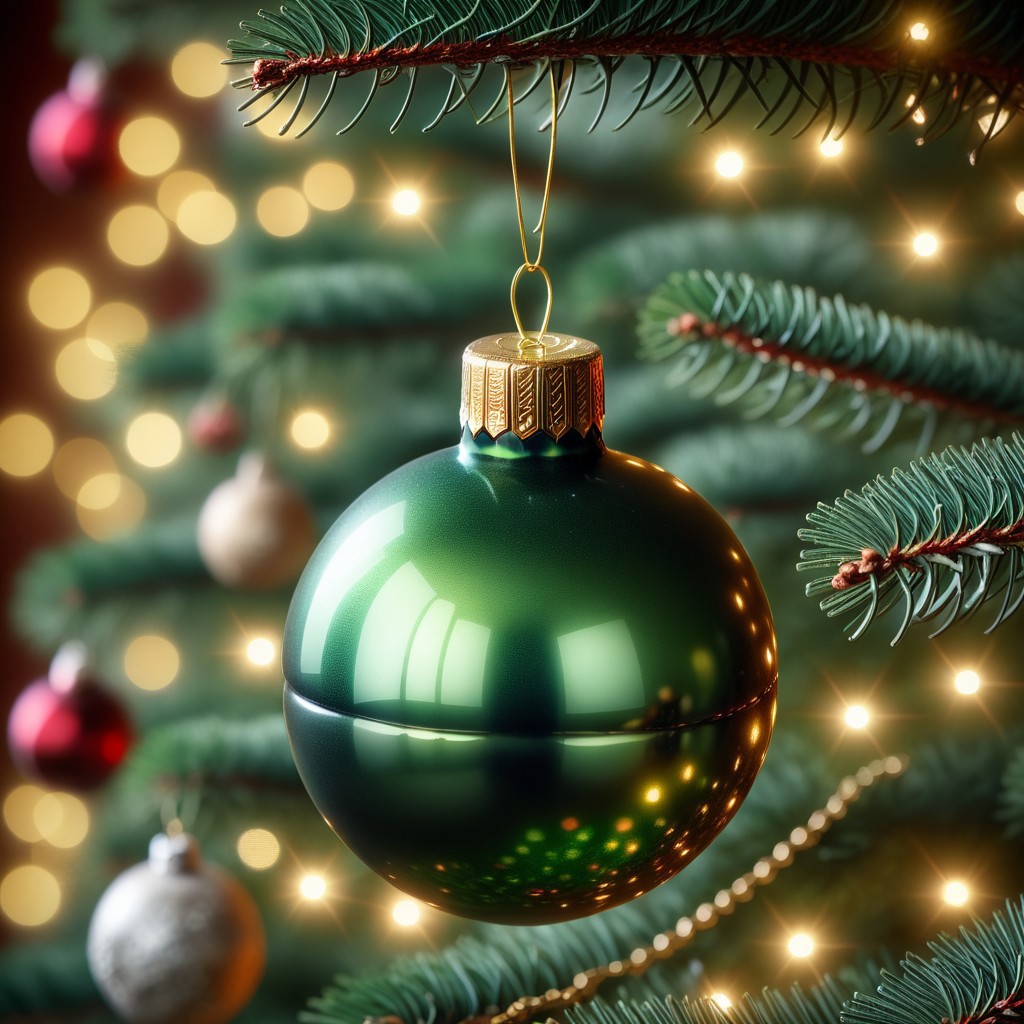 very realistic close-up photograph of a green Christmas sphere with a Christmas bell on it hanging in a Christmas tree branch