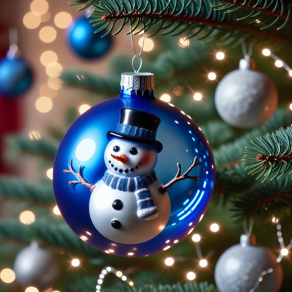 very realistic close-up photograph of a blue Christmas sphere with a snowman on it hanging in a Christmas tree branch