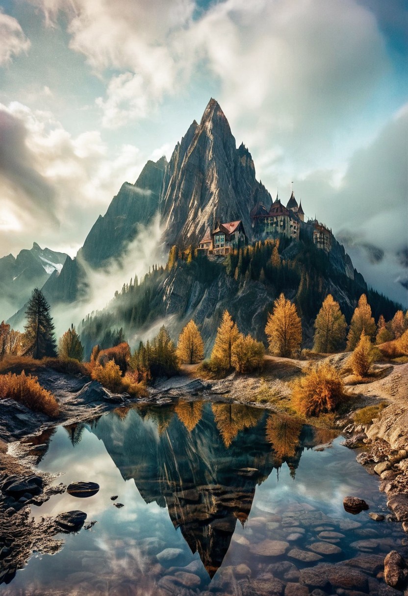 their peaks veiled in mist. mixed media, surrealism, great lighting, A surreal landscape highly detailed . extremely high-resolution details, appears trapped in an optical illusion of reflections and refractions colorful , professional photography, natural lighting, GhostlyStyle, volumetric lighting maximalist. intricately detailed, complex, elegant, expansive, fantastical, film photography style, medium grain, lthndrtrl