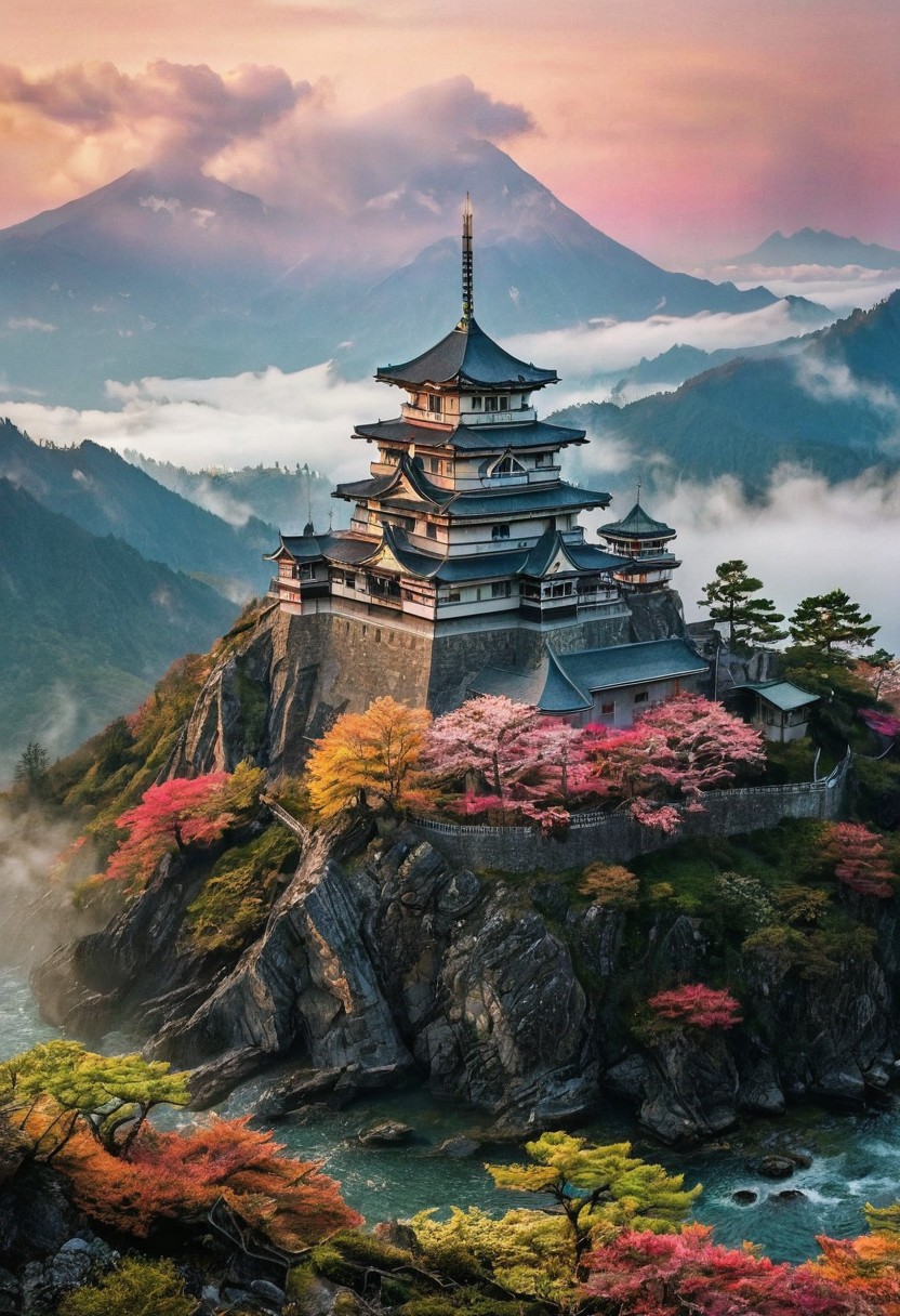 their peaks veiled in mist. mixed media, surrealism, Japan, great lighting, A surreal landscape highly detailed . extremely high-resolution details, appears trapped in an optical illusion of reflections and refractions colorful , Japanese castles built on mountains, professional photography, natural lighting, volumetric lighting maximalist. intricately detailed, complex, elegant, expansive, fantastical, film photography style, medium grain