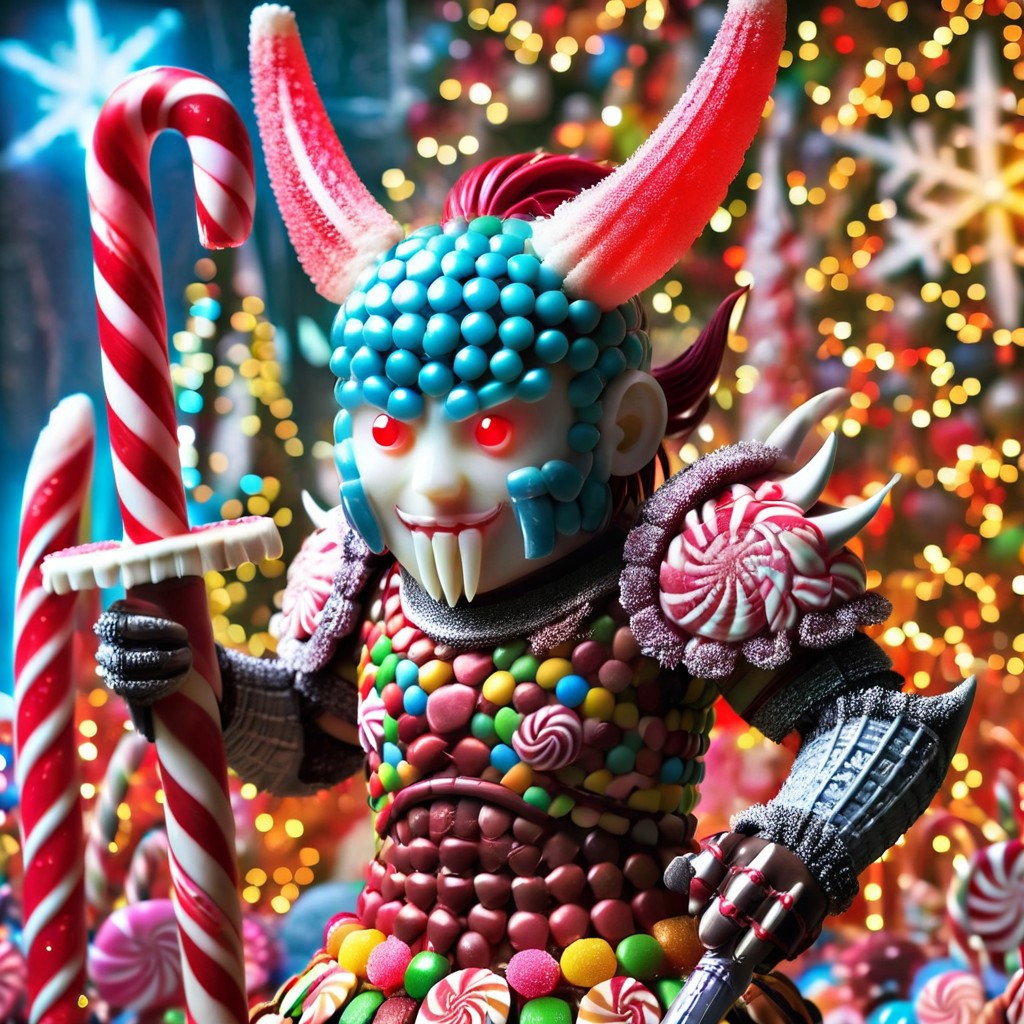 CHRC4ND7, weapon, sword, solo, armor made of candy, 1boy, male focus, holding, dual wielding, samurai, helmet, katana, horns, holding weapon, japanese armor, holding sword, colored skin, red eyes, full body, fighting stance, candy background, glowing, glowing eyes, sheath, standing, gloves, teeth, japanese clothes, red hair, shoulder armor, demon, looking at viewer, mask, ponytail, fangs, Christmas background, blue skin, sharp teeth,