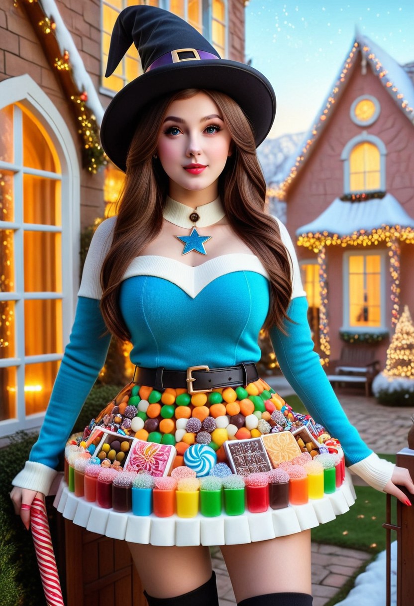 beautiful female, dressed as witch, milf, score_9, score_8_up, score_7_up, score_6_up, score_5_up, score_4_up, UHD, 8K, masterpiece, detailed, ultra_high_resolution, lots of detail, OverallDetailXL, detailxl, regalres, Masterpiece, 32k, photorealistic:1.4, score_9, score_8_up, score_7_up, Caitlin, small waist, fitness body, toned muscles, wide hips, slender legs, high cheekbones, oval face, 32 years old, mature female, milf, makeup, curvy, pretty face, SUPERMODEL, covered breasts, jewelry, sweater, solo, lillybunz, skin tone style, realistic skin, only illuminated by the setting sun, golden glow, sunset, large window, winter, decorated house, standing in the doorway, seen from outside, presenting a box of candy, gives candy, supermodel, seductive smile, sultry, serious stare, stern look, natural skin, long hair, blue belt, black thigh high boots with buckles, white skirt, long skirt, blue eyes, decorations, witch head, holding candybox, showing box with sweets, MagicianAi, pentacle, pentagram, hat, dress, choker, black headwear, wizard hat, bracer, long sleeves, black gloves, hands out of view, arms down, DonMD34thM4g1cXL, CHRC4ND7.