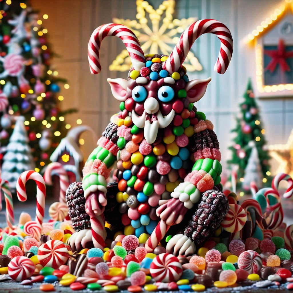 CHRC4ND7, (XmasTad:1.1), (( Krampus(), sitting on a pile of candy while several children that are Made of candy are crying, candy children, highly detailed, dslr