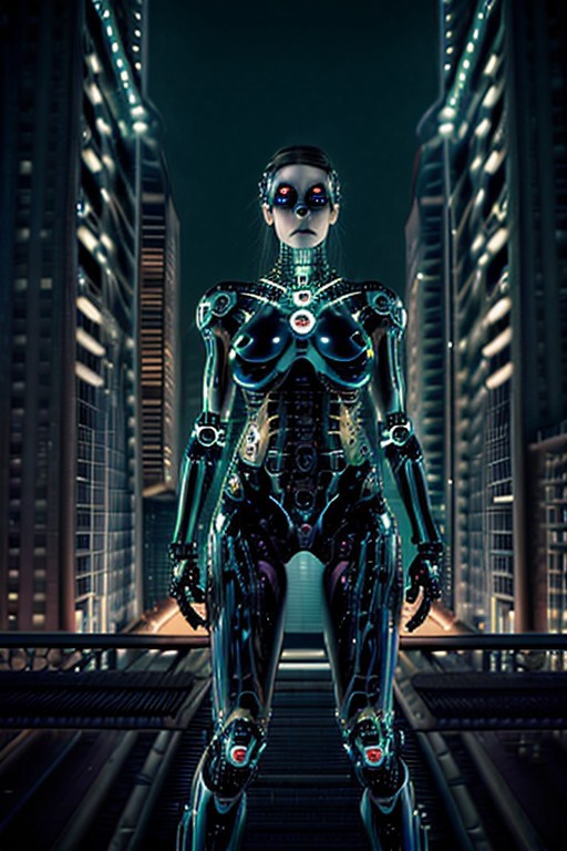 A feminine humanoid AI with expressive eyes gazes at a futuristic city skyline from a high balcony. The city below is alive with glowing vehicles, towering skyscrapers, and interactive billboards. A soft wind moves through her minimalistic attire, face close ip,
