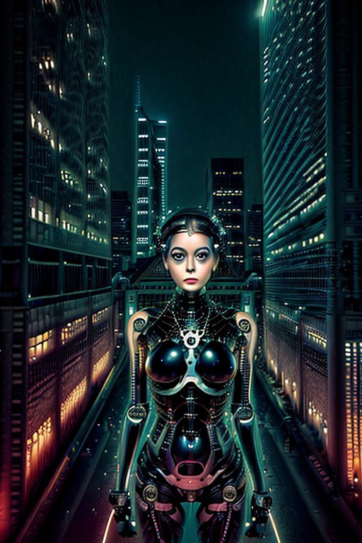 A feminine humanoid AI with expressive eyes gazes at a futuristic city skyline from a high balcony. The city below is alive with glowing vehicles, towering skyscrapers, and interactive billboards. A soft wind moves through her minimalistic attire, face close ip,