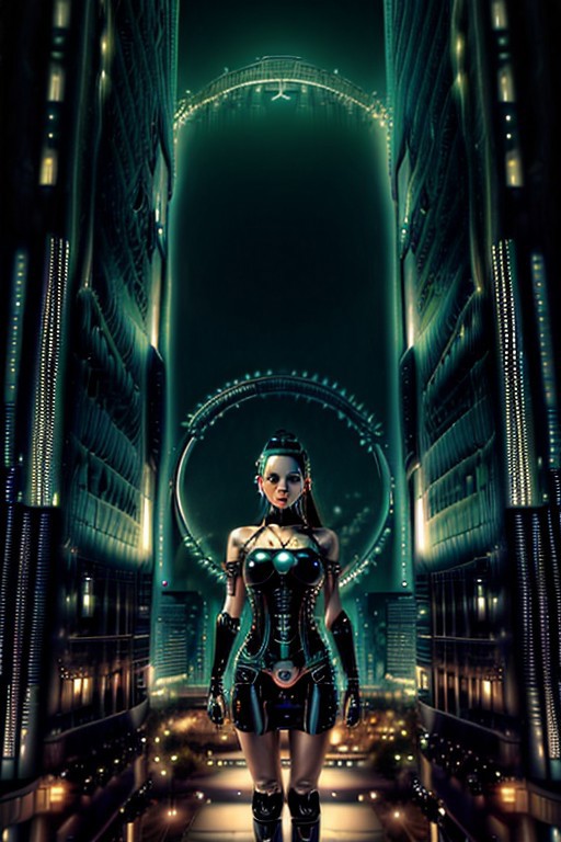 A feminine humanoid AI with expressive eyes gazes at a futuristic city skyline from a high balcony. The city below is alive with glowing vehicles, towering skyscrapers, and interactive billboards. A soft wind moves through her minimalistic attire, face close ip,