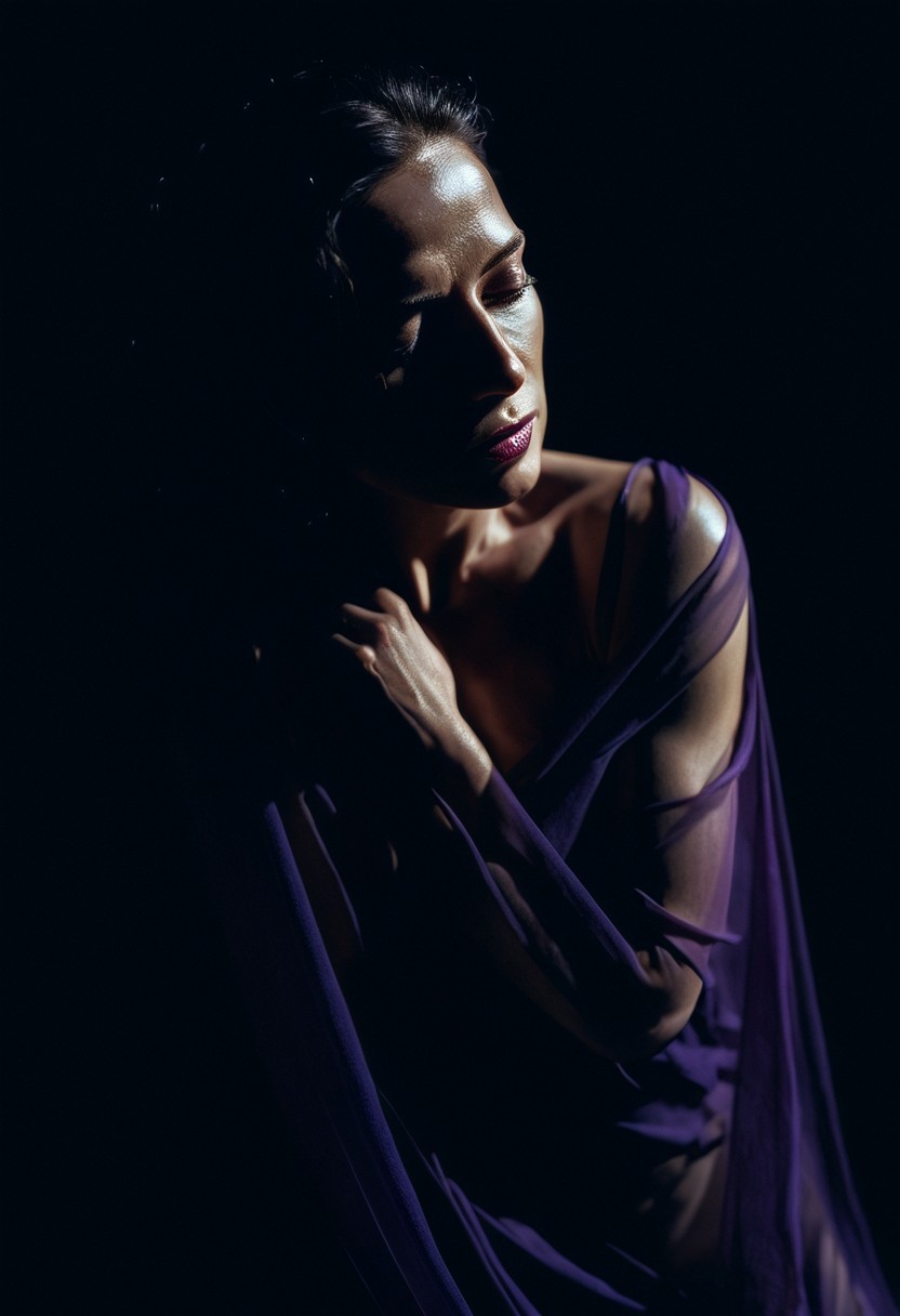 (Mysterious mood Soft Lighting Photography), stunning medium format analog photo, 40yo (Greek woman), photo by Natalia Drepina., nude bodyscape, wrapped around with sheer dark purple cloth, nipples show through the cloth discretely, from below framing, perfect breasts, artistic pose, nude-art, emotive, highly detailed, realistic photography, masterpiece photo, finely detailed skin, low contrast, Fujifilm colors, dof, analog noise grain, detail. Cinematic Hollywood Film, best quality, ISO 300, 1/250s, F/2,8, 38 mm, extremely high quality RAW photograph, 4k, sharp focus, high resolution, 8k UHD, DSLR, high quality, film grain, Fujifilm XT3.