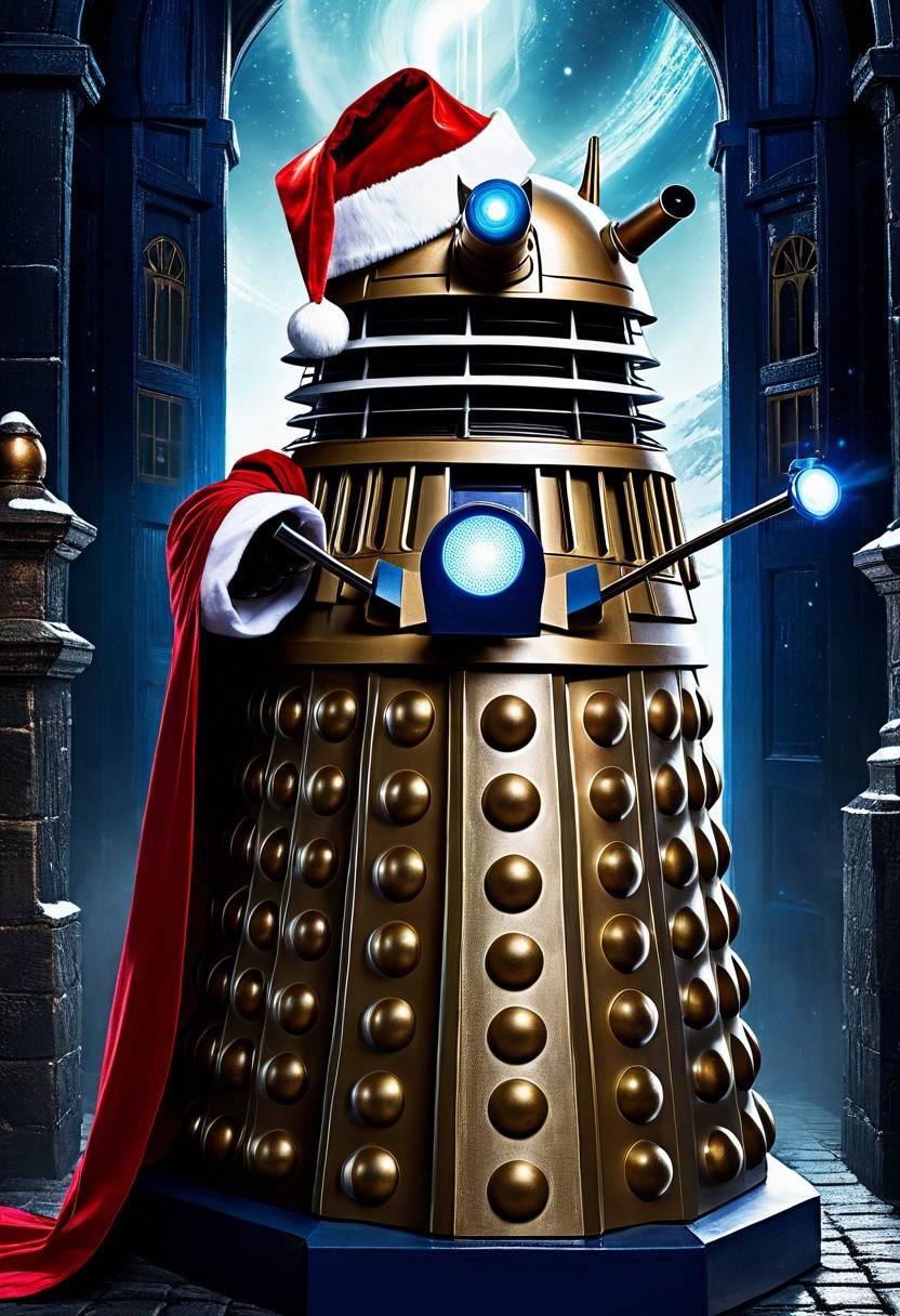 Centered, detailed matte painting, deep color, fantastical, intricate detail, splash screen, complementary colors, fantasy concept art, A Dalek Wearing A Santa Claus stocking cap & Cape, Doctor WHo