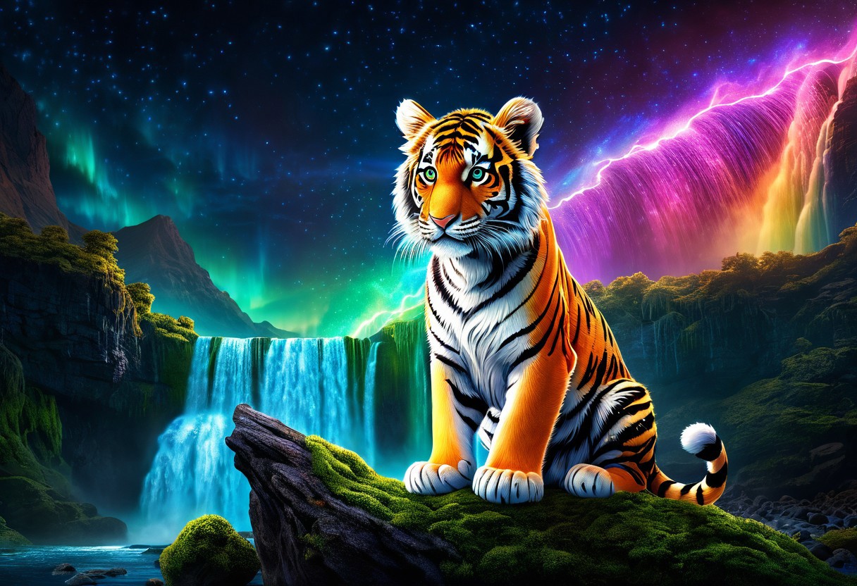 Centered, A glorious epic dream magical waterfall cute adorable little Tiger cub leaning away forward, veins glowing in electricity,a magical dust and aurora, deep colors, gorgeous eyes, glitter, 16k resolution photorealistic, masterpiece, breathtaking intricate details, realistic and lifelike cgi diorama, dramatic dreams lighting, reflective catchlights, high quality CGI VFX fine art, hypermaximalist, holographic, bioluminescence, rainbow field of depth, glowing, side view