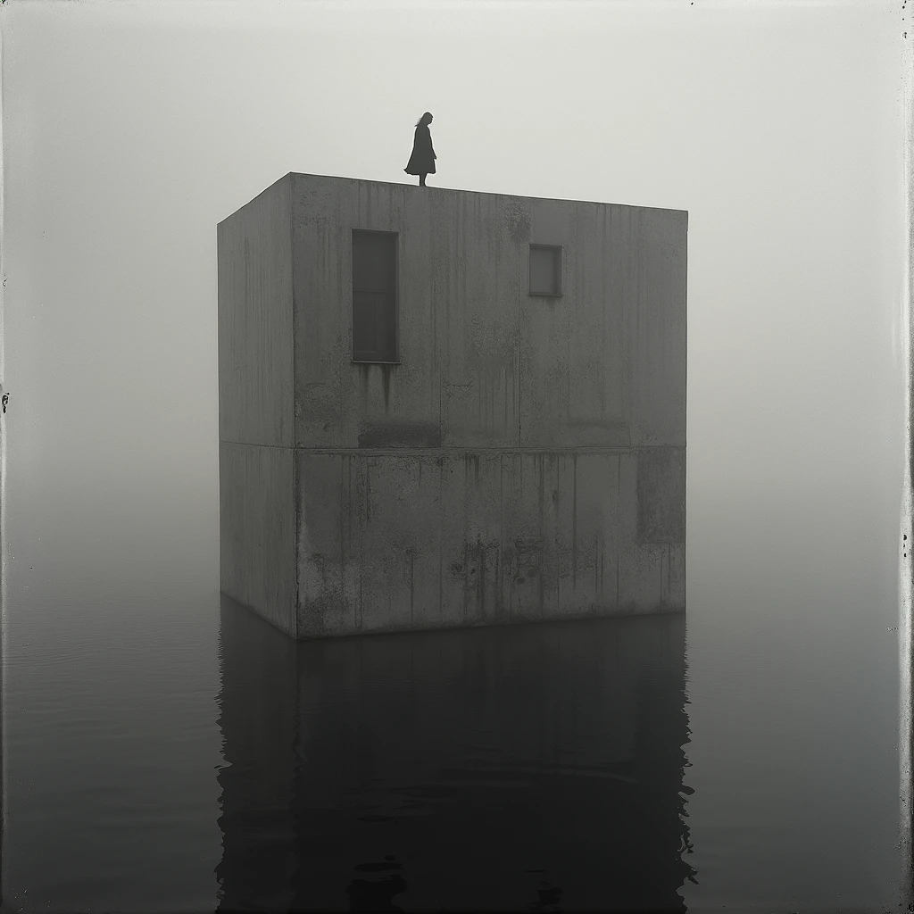 Portrait :: sweet sad charming woman on the top of huge but tight and extreme high concrete Lonely tower high above clouds ::Sunrise:::natural tones :: by Lee Jeffries, Alessio Albi, Adrian Kuipers ::made with yashica mat124g :: 80mm 3.5::ilford 1600 grains and dirts::: rainy, The reflective surfaces of the concrete walls capture the surrounding lights and deep shadowa, creating a dynamic and depressing atmosphere" :: “Surreal dystopian brutalist architecture, massive concrete structures with cracks and weathered stains, rising from foggy reflective black water. Monochromatic, soft diffused lighting, cinematic atmosphere, high detail, black and white