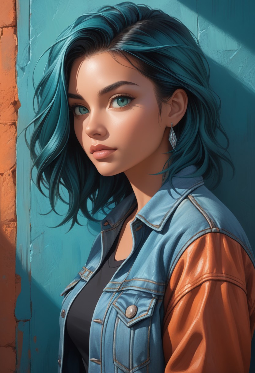 Bold acrylic painting, warm terracotta and cool teal, hyperrealistic fantasy art depicting a person in a denim jacket, dramatic lighting, detailed textures, vibrant colors, textured brushstrokes. Photorealistic, earthy and cool contrast, cinematic atmosphere.