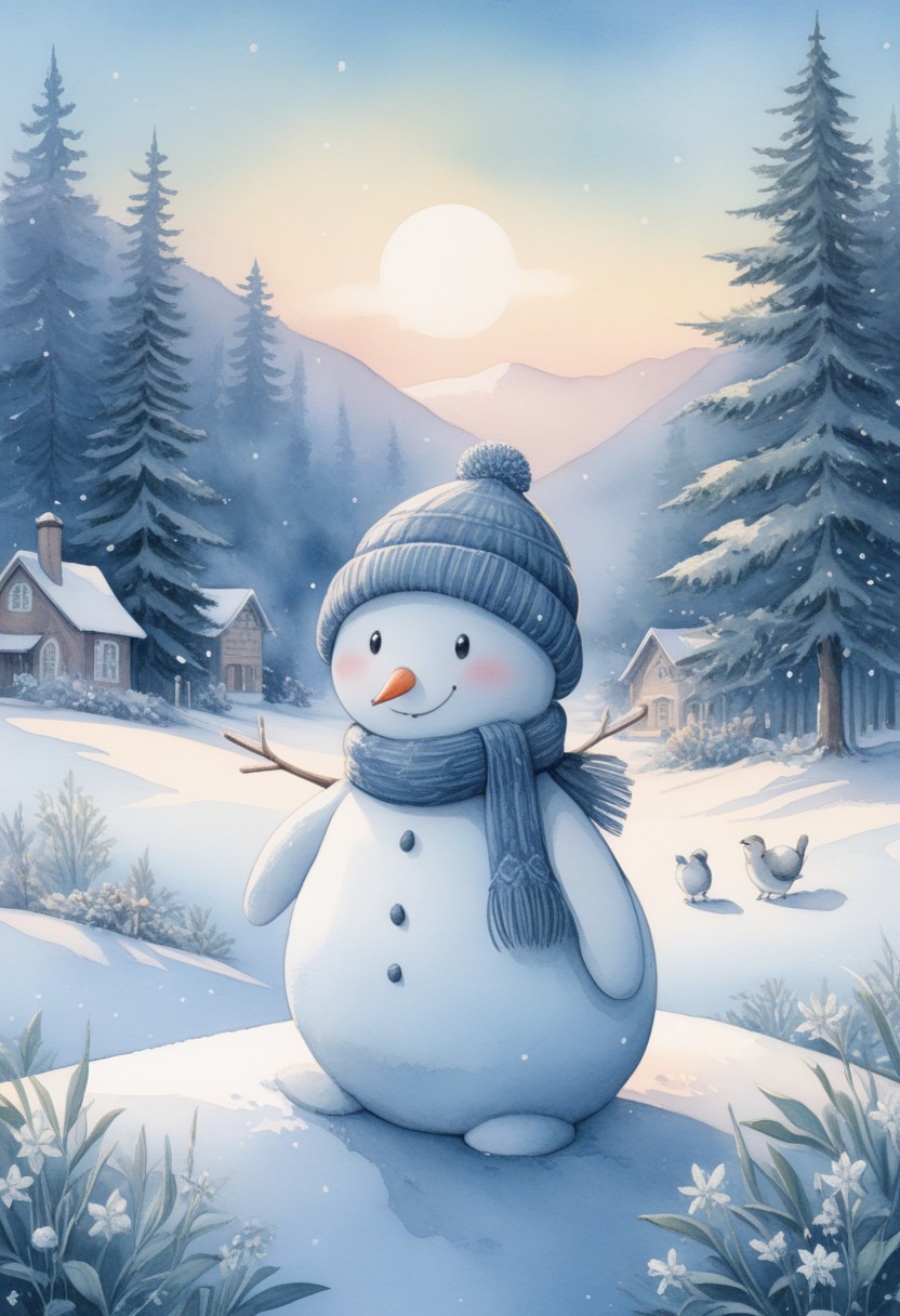 snowflake, fristy the snowman, whimsical illustrations, soft watercolor tones, detailed natural settings, charming animal characters, delicate linework, pastoral landscapes, gentle storytelling, Victorian aesthetic, childlike innocence, warm and inviting, flora and fauna details, timeless and nostalgic, tender and imaginative, classic children's book style