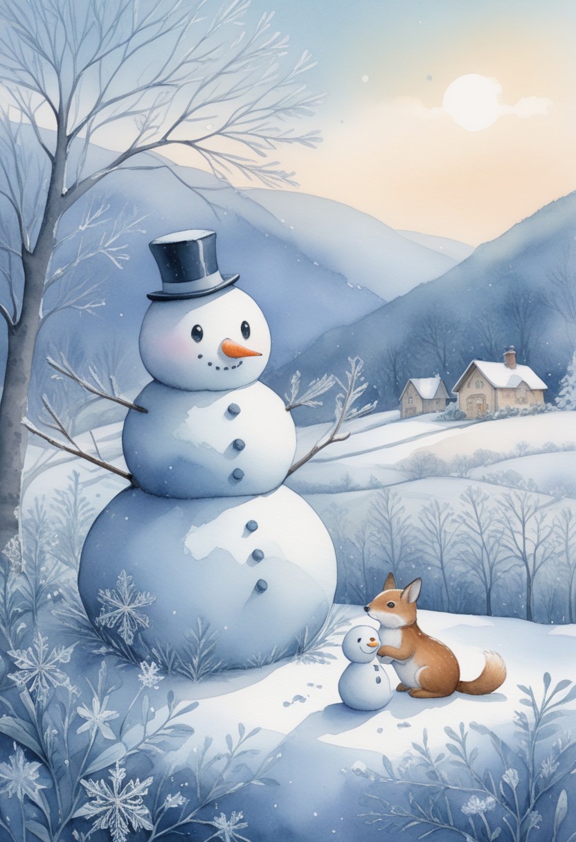snowflake, fristy the snowman, whimsical illustrations, soft watercolor tones, detailed natural settings, charming animal characters, delicate linework, pastoral landscapes, gentle storytelling, Victorian aesthetic, childlike innocence, warm and inviting, flora and fauna details, timeless and nostalgic, tender and imaginative, classic children's book style