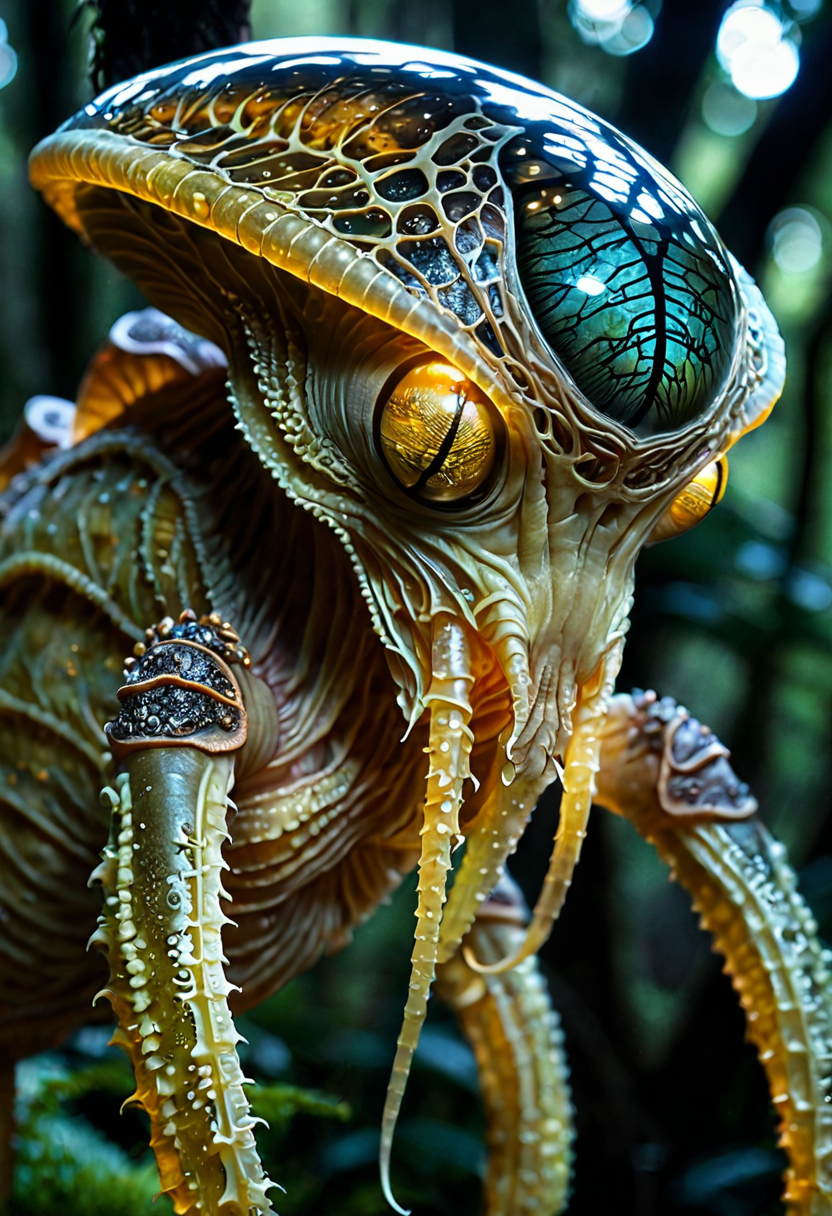a realistic photo, highly detailed, intricate, beware this otherworldly glowing invertebrate abomination, aptly named "giganotus", with its many legs, this exotic, translucent body, Highly detailed eye, deadly poisonous creature roams the bioluminescent skrunkleshroom forests and psionified jungles of its alien world "Toridor II", where gigantic thorgles and towering grumptrees flumber in the mistgolden ratio, Space terraforming, Alien Flora, hyper detailed, trending on artstation, sharp focus, studio photo, intricate details, highly detailed, by greg rutkowski detailed face, detailed skin