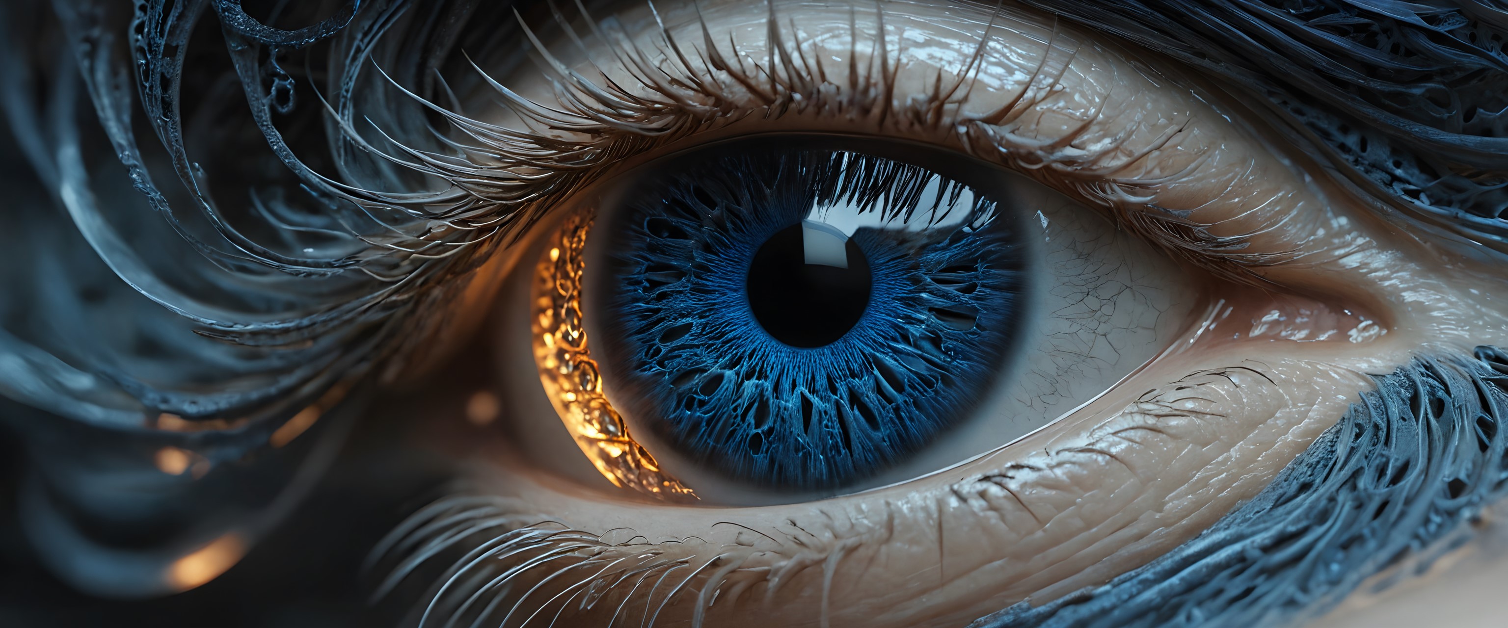 A close-up of an eye with filigrane intricate patterns and glowing lights. A blue spiral on its iris shines like fireflies, rendered in the style of Octane Renderer. hyper-realistic, cinematic 3D. (in the style of Adam Martinakis),