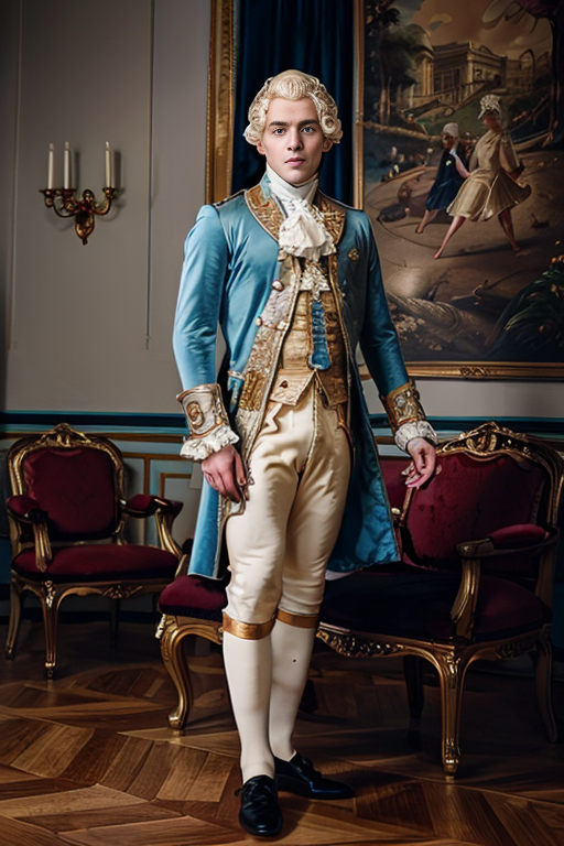 <lora:18th_Century_man_V0-000018:0.65> w16hsl1ps, 1boy, 1man, professional photograph, 4K, 18th century clothes, blue breeches, historical wig, white hair, (ornate background, gold palace interior:1), dramatic lighting, ultra realistic photograph, professional art, by Gucci photographer, (full body shot),ponytail with black ribbon, hat
