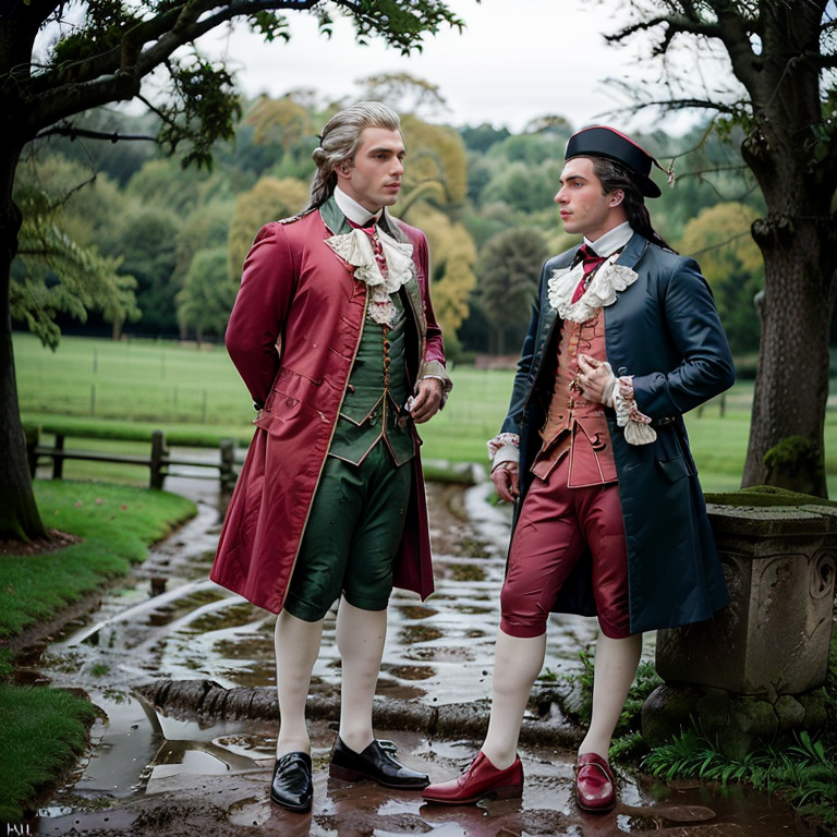 <lora:18th_Century_man_V0-000018:0.7> w16hsl1ps, 2boys, 2men, professional photograph, 4K, 18th century clothes, historical wig, grey hair, rainy field, mud, trees, dramatic lighting, ultra realistic photograph, professional art, by Gucci photographer, medium shot, full body shot, pink lips, (red open coat, dark blue waistcoat, uniform), (from front:1.1), (breaches), white stockings, shoes, (polytail with black ribbon:0.5)