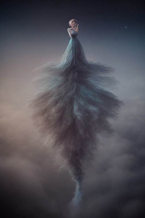 surreal, waltz of fractal smoke over the abyss, fantasy smoke, dresses and stars, dynamics, movement, wind, colorful, intricate details, perspective, hyper-detailed, hyper-realism, professional photoshoot