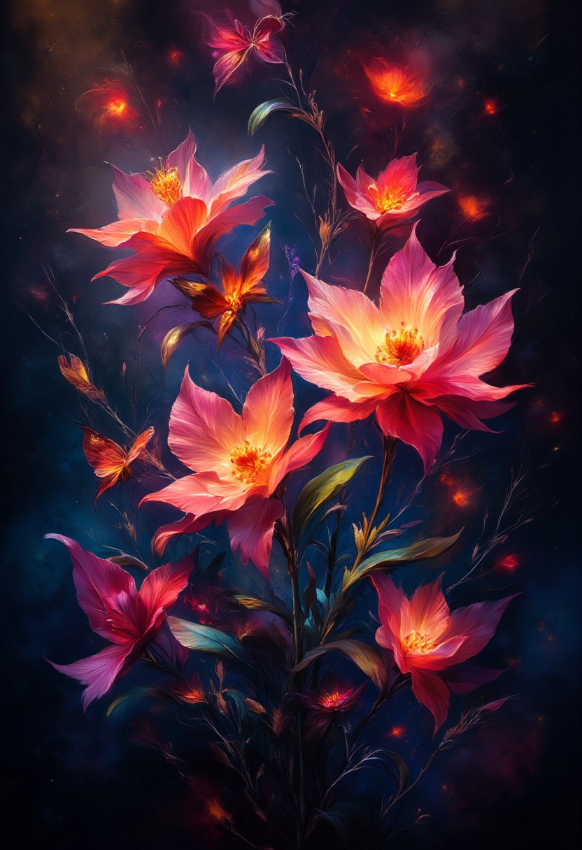 vibrant orange Bleeding Hearts flowers and glowing red butterflies against a pitch-black background Painterly, surreal, vibrant glow, bokeh, 8k,