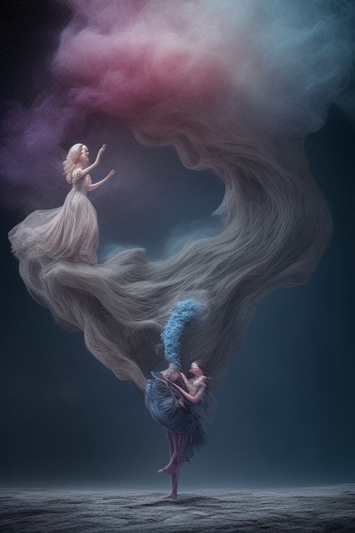 surreal, waltz of fractal smoke over the abyss, fantasy smoke, dresses and stars, dynamics, movement, wind, colorful, intricate details, perspective, hyper-detailed, hyper-realism, professional photoshoot