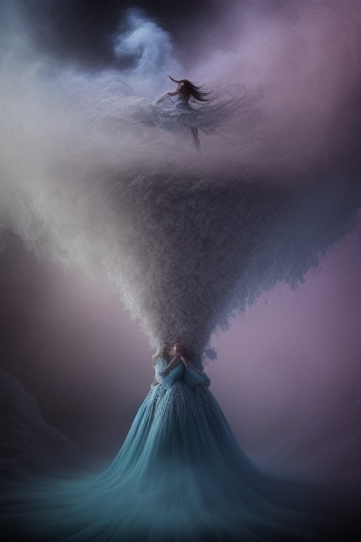 surreal, waltz of fractal smoke over the abyss, fantasy smoke, dresses and stars, dynamics, movement, wind, colorful, intricate details, perspective, hyper-detailed, hyper-realism, professional photoshoot