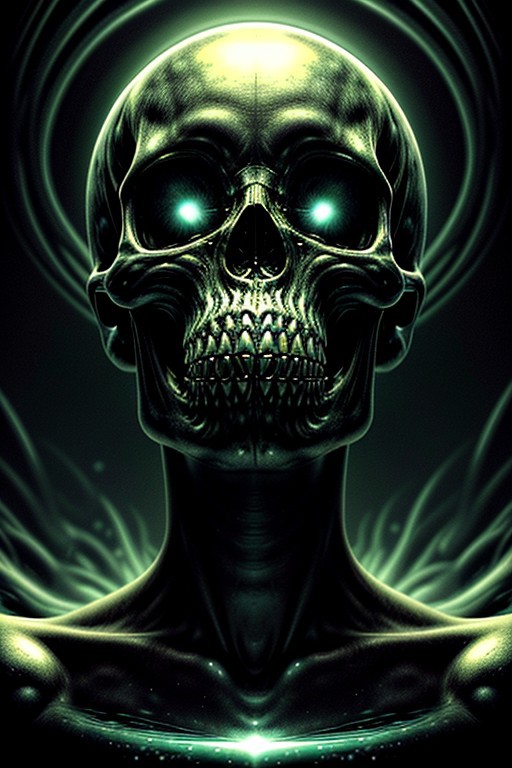 A close-up photorealistic image of a crystal-like floating skull facing dynamic view with its mouth open, pouring from it's mouth a shimmering liquid resembling the universe onto the ground, filled with rich stars and swirling galaxies. A simple void background enhances the dark atmosphere, shrouded in fog, capturing the hypnotic flow and shimmer of the cosmic liquid, evil demon,