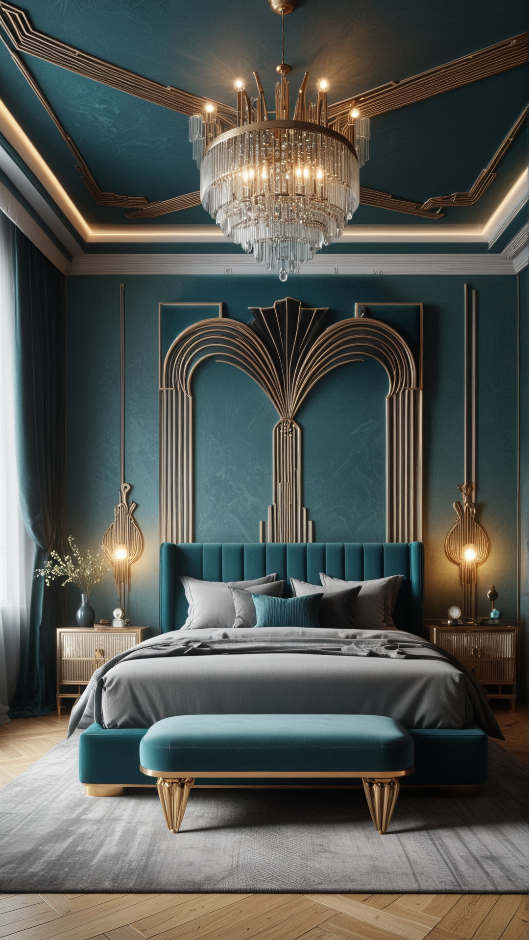 <lora:ArtDecoStyleSDXL:1> ArtDecoStyle luxurious decadent, dark turqoise bedroom, cozy bed, ceiling lamp, wall, recliner, linear patterns, sharp, art deco, RAW photo, realistic, photorealism