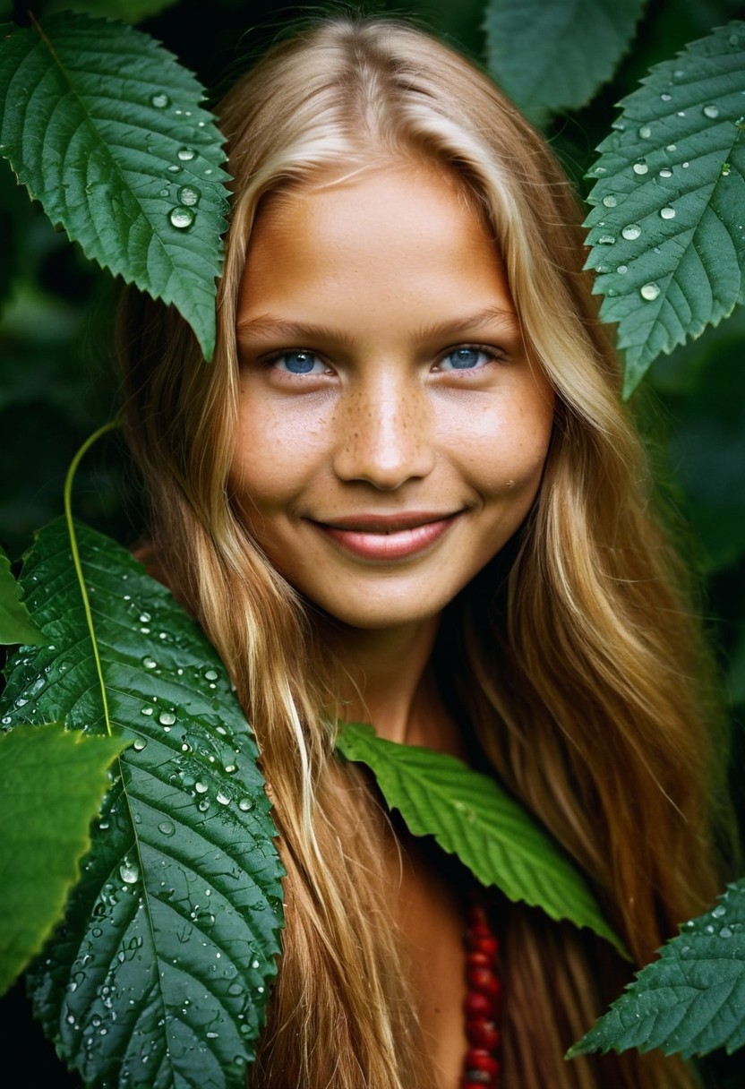 Masterpiece photo,extremely detailed, amazing, Through the dense tangle of dark green leaves, a single dark blue eye, smile [((blonde fashion model sasha luss)):0.35],(elsa-frzn:1.0),best quality, photorealistic,(( <lora:NativeAmericanGirlLoRA:0.75> 1girl, long red hair, native american, dark skin)), peers out from the shadows, intense and watchful. The surrounding foliage frames the eye perfectly, with droplets of dew catching the light and adding a sense of mystery to the scene. The pupil contracts slightly, hinting at something lurking behind the leaves, observing in silence. The thick, layered leaves obscure the face, but the sharp focus on the eye adds tension to the moment, as if it's waiting for something—or someone, realism, realsitic, ((soft light, 8k, high resolution)), dark atmosphere