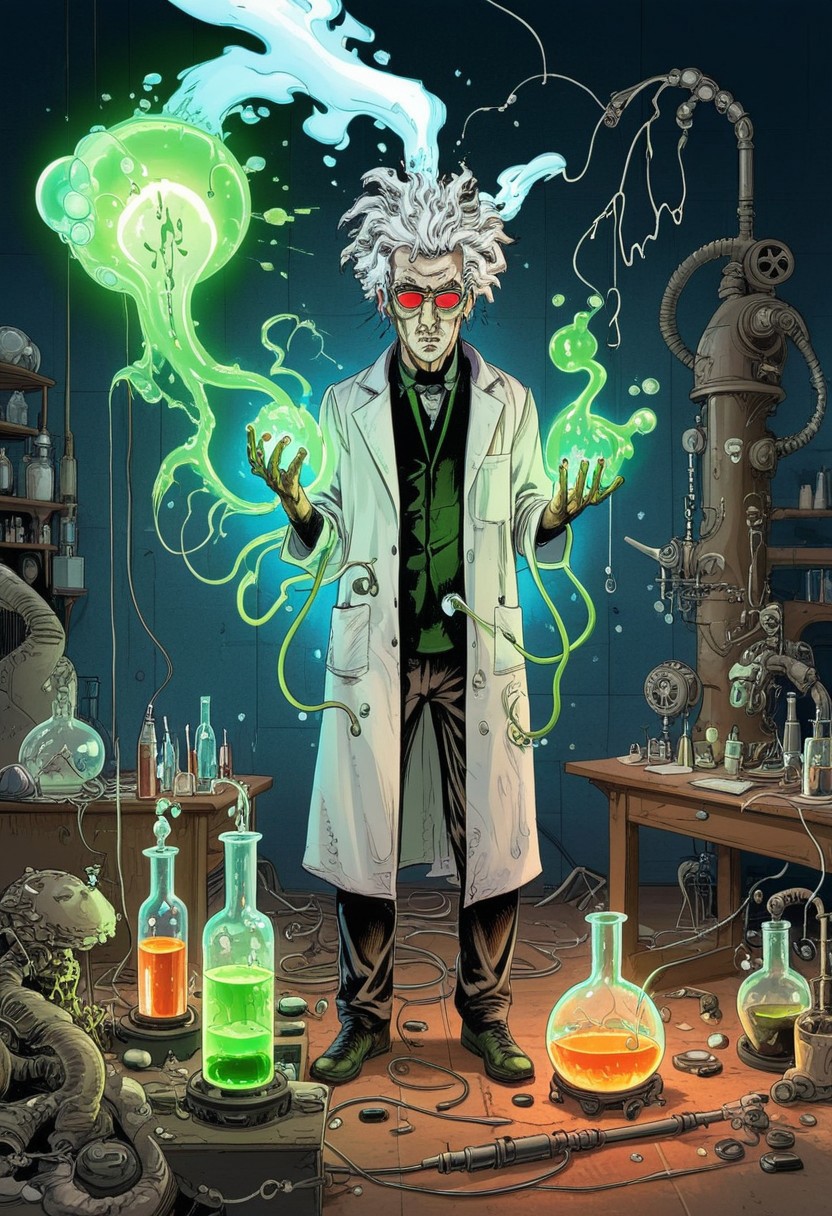 A wild-haired mad scientist toiling in his sinister laboratory, illuminated by flickering neon lights and the eerie glow of bubbling test tubes. His disheveled white hair stands on end like static-charged wires, spilling out from beneath a bizarre helmet adorned with fluorescent, glowing test tubes in hues of green, blue, and orange. He wears a stained and slightly tattered lab coat over mismatched clothing, and thick, oversized goggles obscure his eyes, reflecting the chaotic energy of the lab. Around him, the laboratory is a cacophony of cluttered tables covered with bubbling beakers, sparking Tesla coils, and glowing chemical vials. The air is hazy with smoke and the hum of strange machinery fills the space. Behind him, a large, ominous contraption hums with life, its wires snaking across the floor, as if itas waiting for his next demented revelation.