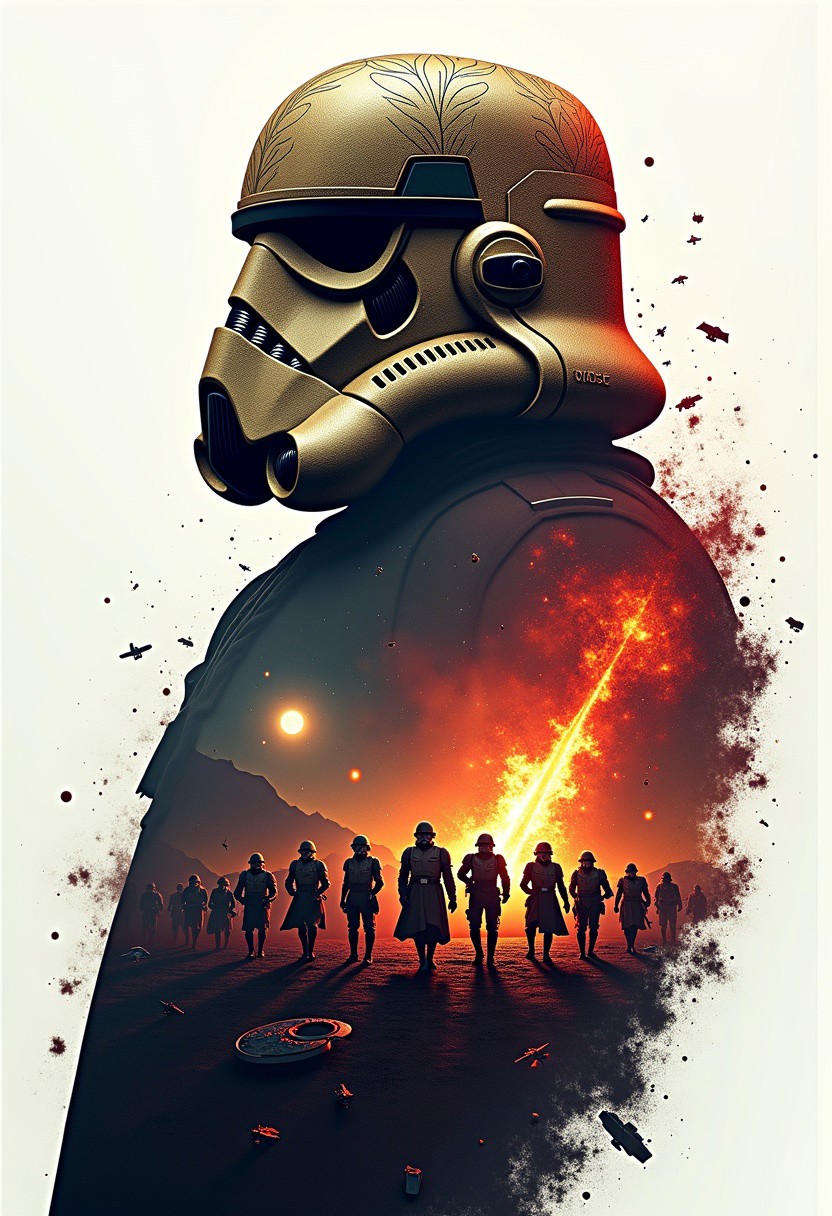 Intricately detailed, A dark, ominous, double-exposure illustration of General Crieveouos, his silhouette meticulously detailed with sharp, angular lines and subtle shading, reminiscent of H.R. Giger's biomechanical style, set against a stark white backdrop. Ornate, tattered Stormtrooper helmets, intricately textured with hints of gold and crimson, evoke the opulent, yet decaying atmosphere of Zdzisław Beksiński's dystopian landscapes. Chaotic, glitched, and pixellated scenes, inspired by Ash Thorp's futuristic, cyberpunk aesthetic, swirl around him, featuring blazing fire castles, erupting volcanoes, and marching soldiers, their forms distorted and fragmented, like shattered glass. A supernova explodes in the distance, casting an otherworldly glow, as planets collide, fires rage, and tsunamis crash, with the Death Star and Star Destroyers looming in the darkness. The scene is bathed in the eerie, darkening shadow of a solar eclipse, blending the surreal, nightmarish quality of H.P. Lovecraft's cosmic horrors with the gritty, industrial feel of Syd Mead's sci-fi environments, in a hyperdetailed, 8k resolution, apocalyptic tableau, with vibrant, clashing colors and textures.