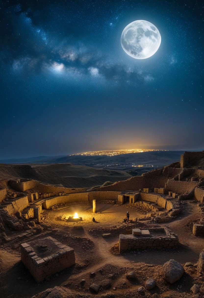 Night Atmosphere,full moon, under starry night sky, an archeologist working at gobekli tepe dig site, cinematic, trending on ArtStation, masterpiece, Award winning