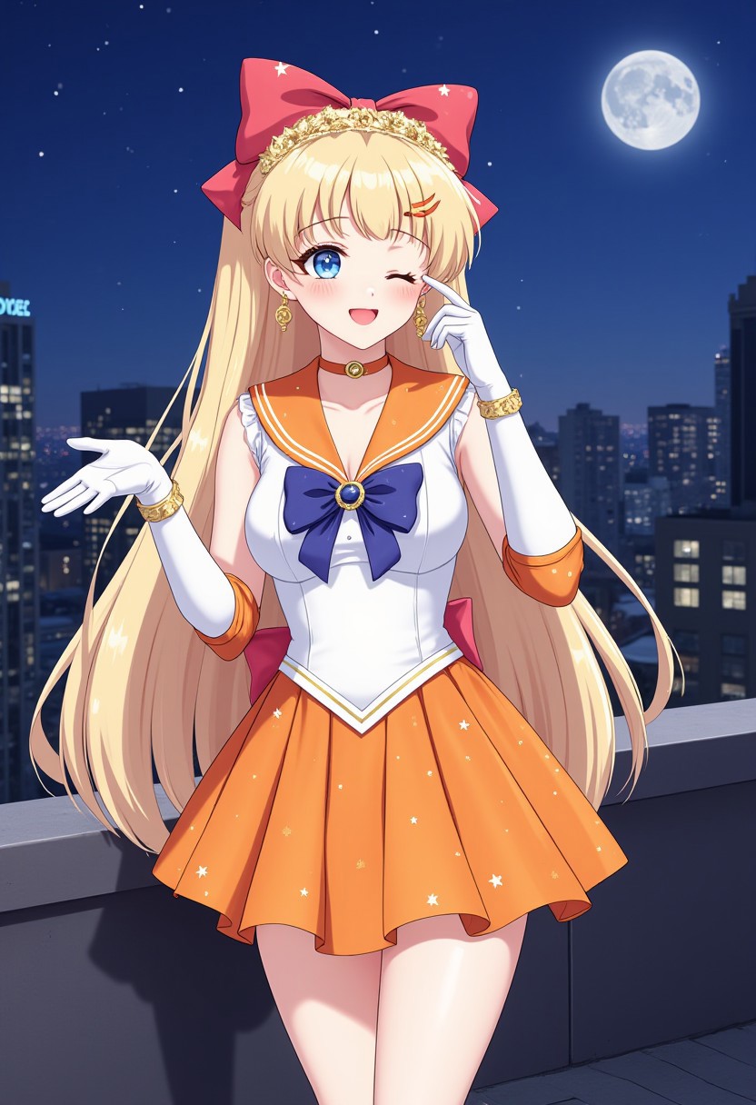 sweetegl, 1girl, aino minako, sailor venus, bishoujo senshi sailor moon, long hair, blonde hair, blue eyes, straight hair, red hair bow, hair bow, bangs, masterpiece, best quality, absurdres, orange sailor senshi uniform, orange skirt, blue bow, elbow gloves, magical girl, pleated skirt, tiara, earrings, jewelry, choker, lipstick, long eyelashes, eyeshadow, eyeliner, mascara, cute makeup, outdoors, night, dark environment, on rooftop, stars, moon, city, solo, standing, crossed legs, cowboy shot, smile with closed eyes, open mouth, looking at viewer, (sparkles, sparkling clothes, sequins, sparkling hair, sparkling makeup), sparkling eyeshadow