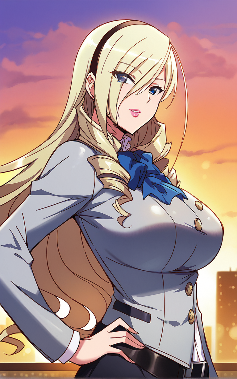 score_9, score_8_up, score_7_up, looking at viewer, BREAK GreyShirt_CeliaCumaniAintree_ownwaifu, 1girl, blonde hair, blue eyes, large breasts, drill hair, long hair, hairband, hair between eyes, lips, eyes visible through hair, bangs, lipstick, pink lips, ascot, blue ribbon, grey shirt, frills, school uniform, belt, black pantyhose, long sleeves, (contrapposto, hand on hip), sunset, sidelighting, cityscape, outdoors, <lora:PONYXL_CeliaCumaniAintree_ownwaifu:1> , depth of field, solo,