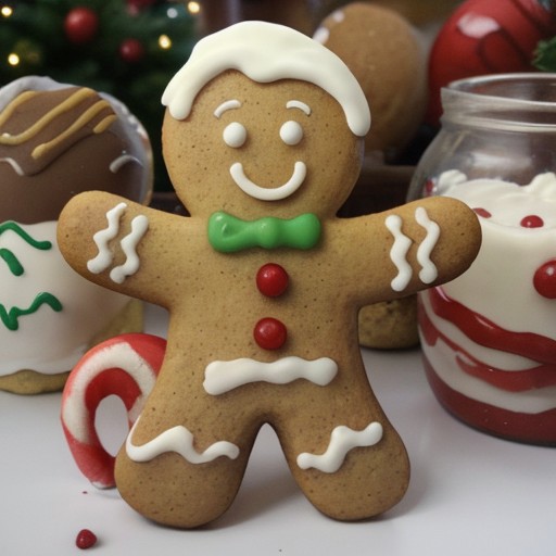 Gingerbread_Man cookie on a holiday dessert table, food focus, surrounded by festive sweets, no humans