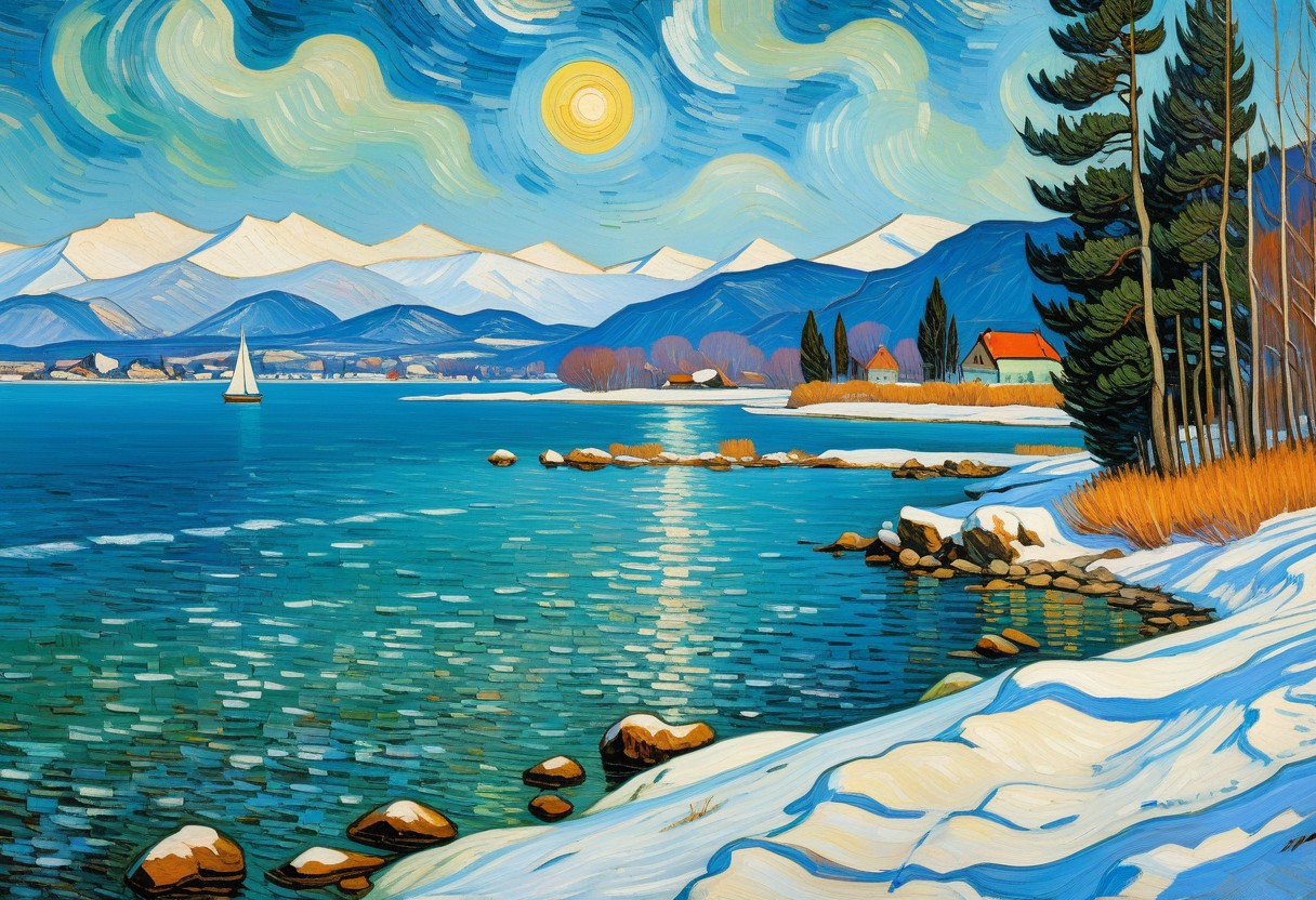 Landscape, Layers of tranquil beauty, Winter On The lakefront, masterpiece, legendary, Van Gogh